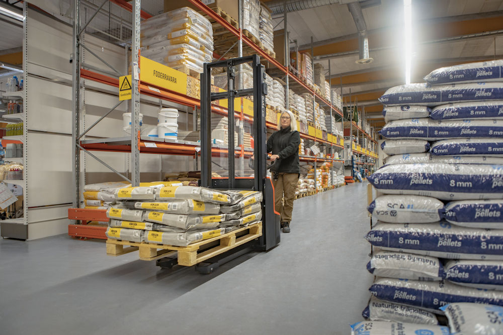 Le gerbeur d'entrée de gamme SHE100 est adapté aux sols plats.